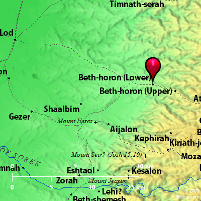 You are free to use up to 50 Biblos coprighted maps (small or large) for your website or presentation. Please credit Biblos.com. Occurrences Joshua 10:10 Yahweh confused them before Israel, and he killed them with a great slaughter at Gibeon, and chased them by the way of the ascent of Beth Horon, and struck them to Azekah and to Makkedah. Joshua 10:11 It happened, as they fled from before Israel, while they were at the descent of Beth Horon, that Yahweh cast down great stones from the sky on them to Azekah, and they died. There were more who died from the hailstones than who the children of Israel killed with the sword. Joshua 16:3 and it went down westward to the border of the Japhletites, to the border of Beth Horon the lower, even to Gezer; and ended at the sea. Joshua 18:13 The border passed along from there to Luz, to the side of Luz (the same is Bethel), southward. The border went down to Ataroth Addar, by the mountain that lies on the south of Beth Horon the lower. Joshua 18:14 The border extended, and turned around on the west quarter southward, from the mountain that lies before Beth Horon southward; and ended at Kiriath Baal (the same is Kiriath Jearim), a city of the children of Judah. This was the west quarter. Joshua 21:22 Kibzaim with its suburbs, and Beth Horon with its suburbs; four cities. 1 Samuel 13:18 and another company turned the way to Beth Horon; and another company turned the way of the border that looks down on the valley of Zeboim toward the wilderness. 1 Kings 9:17 Solomon built Gezer, and Beth Horon the lower, 1 Chronicles 6:68 and Jokmeam with its suburbs, and Beth Horon with its suburbs, 1 Chronicles 7:24 His daughter was Sheerah, who built Beth Horon the lower and the upper, and Uzzen Sheerah. 2 Chronicles 8:5 Also he built Beth Horon the upper, and Beth Horon the lower, fortified cities, with walls, gates, and bars; 2 Chronicles 25:13 But the men of the army whom Amaziah sent back, that they should not go with him to battle, fell on the cities of Judah, from Samaria even to Beth Horon, and struck of them three thousand, and took much spoil. Encyclopedia BETH-HORONbeth-ho'-ron (beth-choron (other Hebrew forms occur); Bethoron, probably the "place of the hollow"; compare Hauran, "the hollow"):