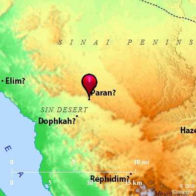 PA'RAN, desert of, now called Badiet et Tih, "desert of the wandering," a great table-land lying between Egypt and the gulf of Arabah. It is n. of the region of Horeb and Mt. Sinai, bounded n. by Palestine, w. by the isthmus of Suez and part of the gulf of Suez, s. by a great sand belt separating it from the mountainous region of the Sinaitic peninsula and e. by the long valley w. of Edom, called The Arabah. See Map No. 4. This Arabah valley is supposed to be the Wilderness of Zin, w. of which, some 40 to 50 ms., was Kades'h now called Kudes, or Gadis, by some, see Kadesh-barnea.
