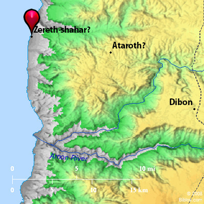 ZA'RETH-SHAHAR, a city in R. about 1 1/2 ms. e. of the Dead Sea, near the mouth of the Zerka Main, is a place called Zara or Sara, a mere heap of stones, which may mark the ancient town site.