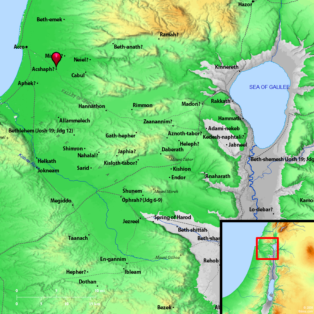 Atlas ![]() Achshaph and surrounding region Maps Created using Biblemapper 3.0 Additional data from OpenBible.info You are free to use up to 50 Biblos coprighted maps (small or large) for your website or presentation. Please credit Biblos.com. Occurrences Joshua 11:1 It happened, when Jabin king of Hazor heard of it, that he sent to Jobab king of Madon, to the king of Shimron, to the king of Achshaph,Joshua 12:20 the king of Shimron Meron, one; the king of Achshaph, one; Joshua 19:25 Their border was Helkath, Hali, Beten, Achshaph, Encyclopedia ACHSHAPHak'-shaf ('akhshaph, "sorcery," or "fascination"): A city in the northern part of the territory conquered by Joshua. The king of Achshaph was a member of the coalition against Israel under Jabin and Sisera. It is mentioned with Hazor, Megiddo, Taanach, etc., in the list of conquered kings. It is one of the cities marking the boundaries of the tribe of Asher (Joshua 11:1; Joshua 12:20; Joshua 19:25). Several attempts have been made to identify the site of it, but explorers are not agreed as to the identification. ACHSHAPH (pron. ak'shaf); now culled Iksaf, 104 ms. n. of Jerusalem, 1835 ft. above the Mediterranean, and 16 1/2 ms. due e. From Tyre. Strong's Hebrew H407: Akshapha place in N. Canaan |