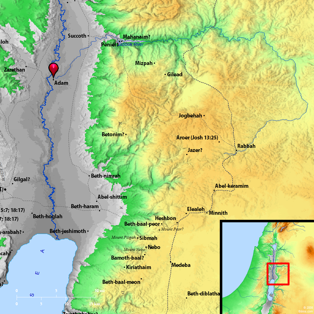 Atlas ![]() Adam and surrounding region Maps Created using Biblemapper 3.0 Additional data from OpenBible.info You are free to use up to 50 Biblos coprighted maps (small or large) for your website or presentation. Please credit Biblos.com. Occurrences Joshua 3:16 that the waters which came down from above stood, and rose up in one heap, a great way off, at Adam, the city that is beside Zarethan; and those that went down toward the sea of the Arabah, even the Salt Sea, were wholly cut off. Then the people passed over right against Jericho.Encyclopedia ADAM, CITY OF('adham, "red" or BDB "made"): A city in the middle of the Jordan valley near ZARETHAN (Joshua 3:16), which see. The name probably survives at the Damieh Ford, near the mouth of the Jabbok twenty miles above Jericho. An Arabian historian asserts that about 1265 A.D. the Jordan was here blocked by a land slide. The inner gorge of the Jordan is here narrow with high banks which would facilitate such an obstruction as permitted the waters to "pile up" above to Adam and run out below, permitting Joshua's host to cross on dry land (SWP, II, 15; Wright, SCOTH, 130-34). |