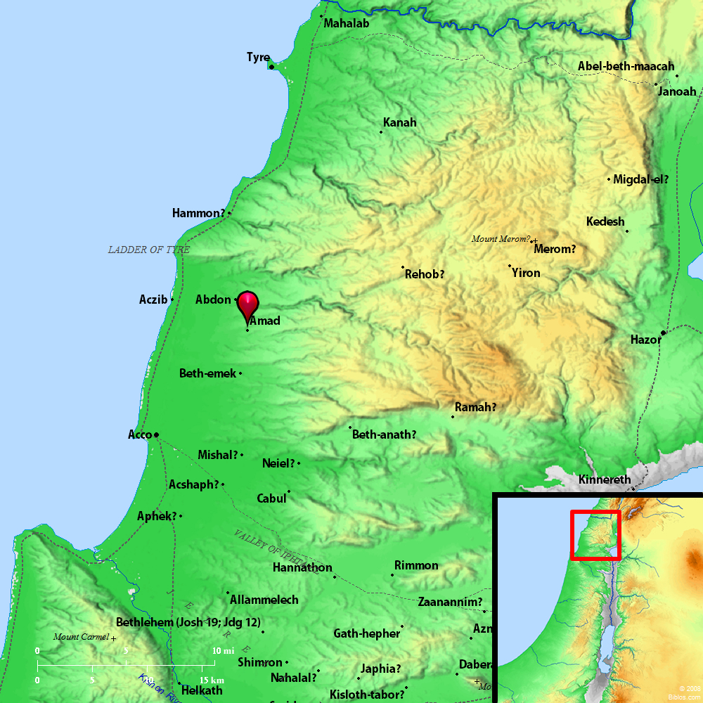 Atlas ![]() Amad and surrounding region Maps Created using Biblemapper 3.0 Additional data from OpenBible.info You are free to use up to 50 Biblos coprighted maps (small or large) for your website or presentation. Please credit Biblos.com. Occurrences Joshua 19:26 Allammelech, Amad, Mishal. It reached to Carmel westward, and to Shihorlibnath.Encyclopedia AMADa'-mad (`am`adh): A town in northern Palestine, which fell to the tribe of Asher in the division of the land (Joshua 19:26). The modern ruin `Amud near Accho may be the site. Strong's Hebrew H6008: Amada place in Asher |