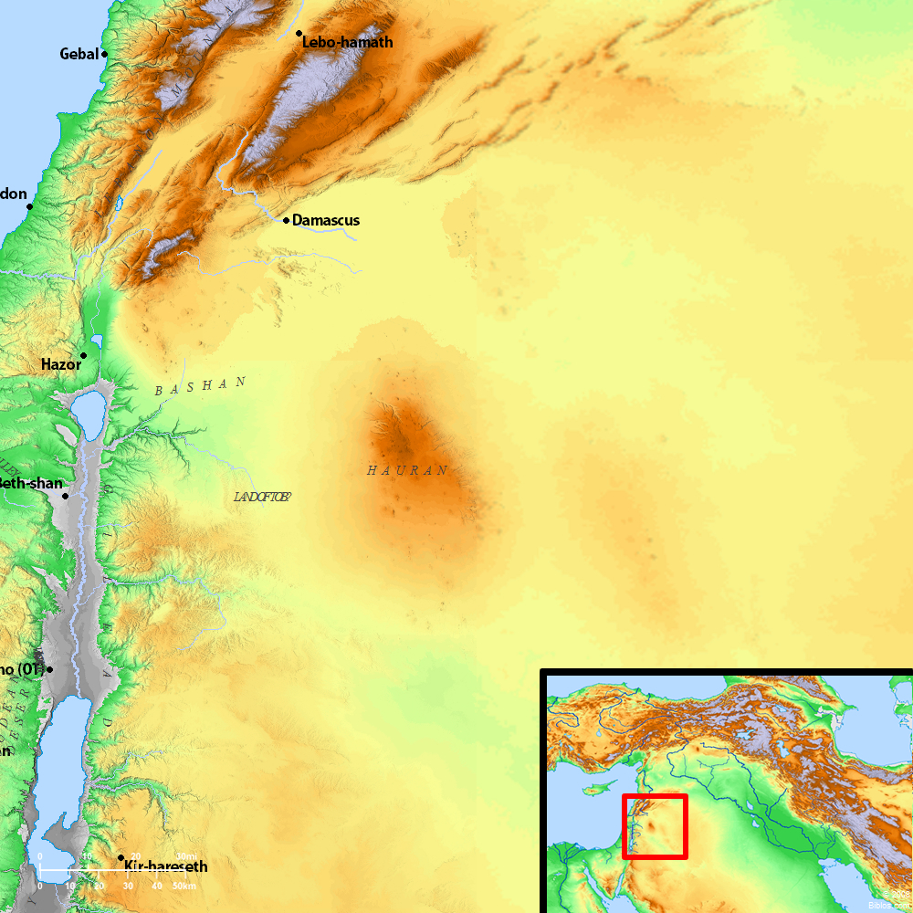 The name Chauran probably means "hollow land." Between Jebel ed-Druze (see BASHAN (MOUNT OF) on the East, and Jedua and Jaulan (see GOLAN) on the West, runs a broad vale, from Jebel el `Aswad in the North, to the Yarmuk in the Southwest, and the open desert in the Southeast. It is from 1,500 to 2,000 ft. above sea-level, and almost 50 miles in length, by 45 in breadth. Chauran aptly describes it. To the modern Chauran are reckoned 3 districts, clearly distinguished in local speech: