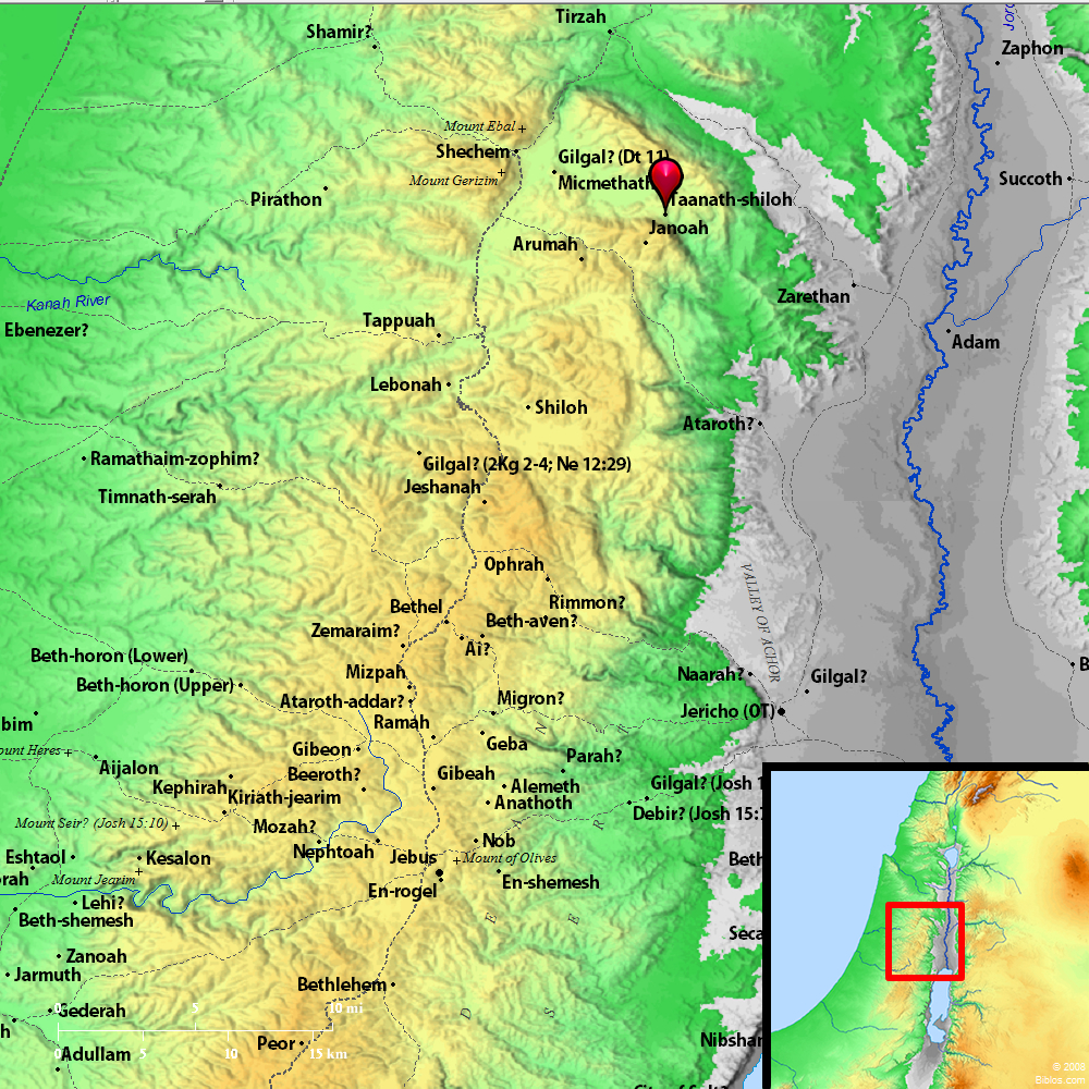 Atlas ![]() Taanath-shiloh and surrounding region Maps Created using Biblemapper 3.0 Additional data from OpenBible.info You are free to use up to 50 Biblos coprighted maps (small or large) for your website or presentation. Please credit Biblos.com. Occurrences Joshua 16:6 The border went out westward at Michmethath on the north. The border turned about eastward to Taanath Shiloh, and passed along it on the east of Janoah.Encyclopedia TAANATH-SHILOHta'-a-nath-shi'-lo (ta'-anath shiloh; Codex Vaticanus Thenasa kai Sellesa, Tenathselo): A town on the border of the territory of Ephraim named between Michmethath and Janoah (Joshua 16:6). According to Eusebius, Onomasticon (s.v. "Thena") it lay about 10 Roman miles East of Neapolis, on the road to the Jordan. Ptolemy speaks of Thena, probably the same place, as a town in Samaria (Joshua 16:5). It may be identified with Ta`na, a village about 7 miles Southeast of Nablus. Yanun, the ancient Janoah, lies 2 miles to the South. A Roman road from Neapolis to the Jordan valley passed this way. At Ta`na there are "foundations, caves, cisterns and rockcut tombs" (PEFM, II, 245). This identification being quite satisfactory, the Talmudic notion that Taanath-shiloh was the same place as Shiloh may be dismissed (Jerusalem Talmud, Meghillah, i). Strong's Hebrew H8387: Taanath Shilohperhaps "approach to Shiloh," a city of Ephraim |