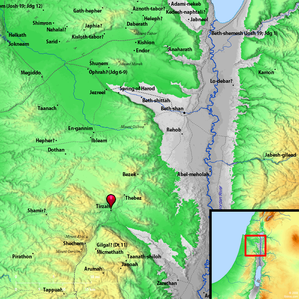 Atlas ![]() Tirzah and surrounding region Maps Created using Biblemapper 3.0 Additional data from OpenBible.info You are free to use up to 50 Biblos coprighted maps (small or large) for your website or presentation. Please credit Biblos.com. Occurrences Joshua 12:24 the king of Tirzah, one: all the kings thirty-one.1 Kings 14:17 Jeroboam's wife arose, and departed, and came to Tirzah. As she came to the threshold of the house, the child died. 1 Kings 15:21 It happened, when Baasha heard of it, that he left off building Ramah, and lived in Tirzah. 1 Kings 15:33 In the third year of Asa king of Judah began Baasha the son of Ahijah to reign over all Israel in Tirzah, and reigned twenty-four years. 1 Kings 16:6 Baasha slept with his fathers, and was buried in Tirzah; and Elah his son reigned in his place. 1 Kings 16:8 In the twenty-sixth year of Asa king of Judah began Elah the son of Baasha to reign over Israel in Tirzah, and reigned two years. 1 Kings 16:9 His servant Zimri, captain of half his chariots, conspired against him. Now he was in Tirzah, drinking himself drunk in the house of Arza, who was over the household in Tirzah: 1 Kings 16:15 In the twenty-seventh year of Asa king of Judah did Zimri reign seven days in Tirzah. Now the people were encamped against Gibbethon, which belonged to the Philistines. 1 Kings 16:17 Omri went up from Gibbethon, and all Israel with him, and they besieged Tirzah. 1 Kings 16:23 In the thirty-first year of Asa king of Judah began Omri to reign over Israel, and reigned twelve years: six years reigned he in Tirzah. 2 Kings 15:14 Menahem the son of Gadi went up from Tirzah, and came to Samaria, and struck Shallum the son of Jabesh in Samaria, and killed him, and reigned in his place. 2 Kings 15:16 Then Menahem struck Tiphsah, and all who were therein, and its borders, from Tirzah: because they didn't open to him, therefore he struck it; and all the women therein who were with child he ripped up. Encyclopedia TIRZAHtur'-za (tirtsah; Thersa): |