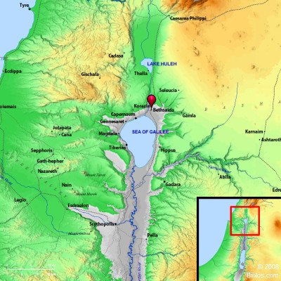 (1) A city East of the Jordan, in a "desert place" (that is, uncultivated ground used for grazing) at which Jesus miraculously fed the multitude with five loaves and two fishes (Mark 6:32 Luke 9:10). This is doubtless to be identified with the village of Bethsaida in Lower Gaulonitis which the Tetrarch Philip raised to the rank of a city, and called Julias, in honor of Julia, the daughter of Augustus. It lay near the place where the Jordan enters the Sea of Gennesaret (Ant., XVIII, ii, 1; BJ, II, ix, 1; III, x, 7; Vita, 72). This city may be located at et-Tell, a ruined site on the East side of the Jordan on rising ground, fully a mile from the sea. As this is too far from the sea for a fishing village, Schumacher (The Jaulan, 246) suggests that el-`Araj, "a large, completely destroyed site close to the lake," connected in ancient times with et-Tell "by the beautiful roads still visible," may have been the fishing village, and et-Tell the princely residence. He is however inclined to favor el-Mes`adiyeh, a ruin and winter village of Arab et-Tellawiyeh, which stands on an artificial mound, about a mile and a half from the mouth of the Jordan. It should be noted, however, that the name is in origin radically different from Bethsaida. The substitution of sin for cad is easy: but the insertion of the guttural `ain is impossible. No trace of the name Bethsaida has been found in the district; but any one of the sites named would meet the requirements.